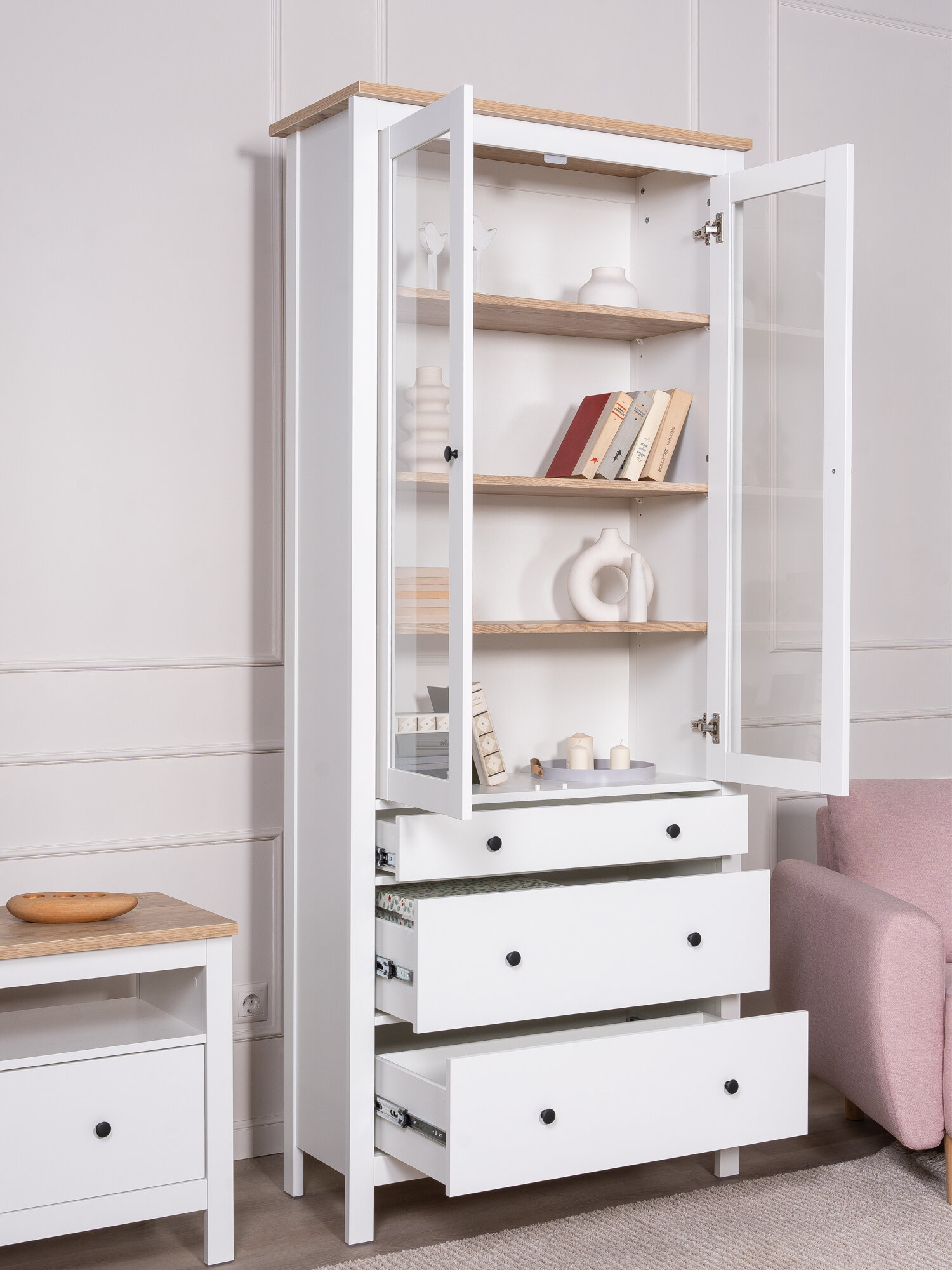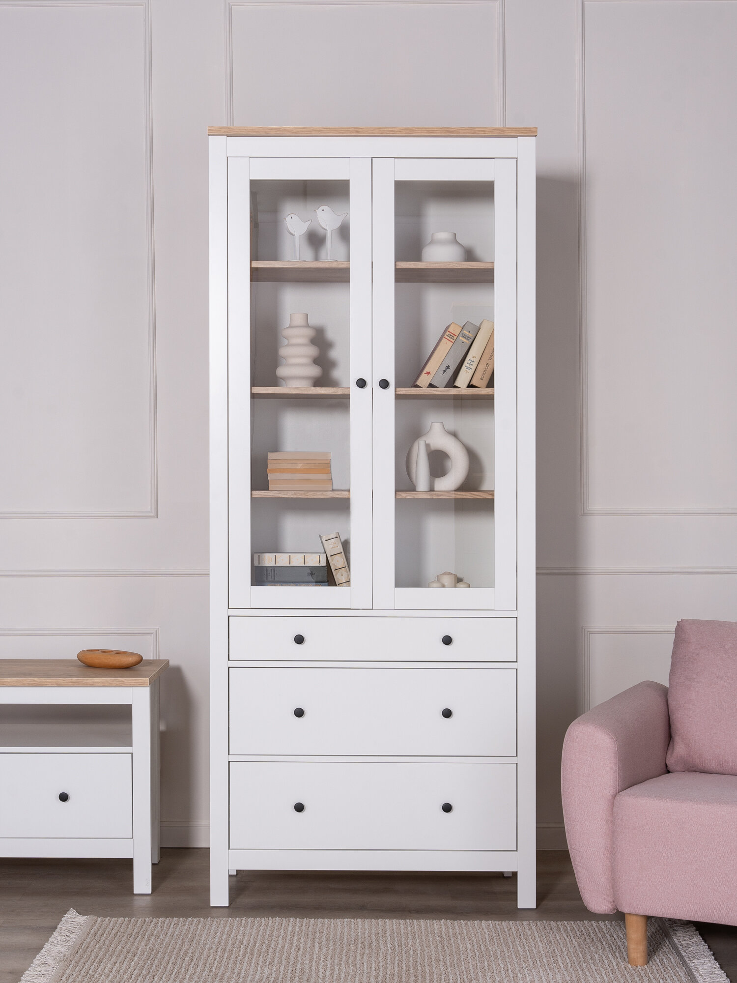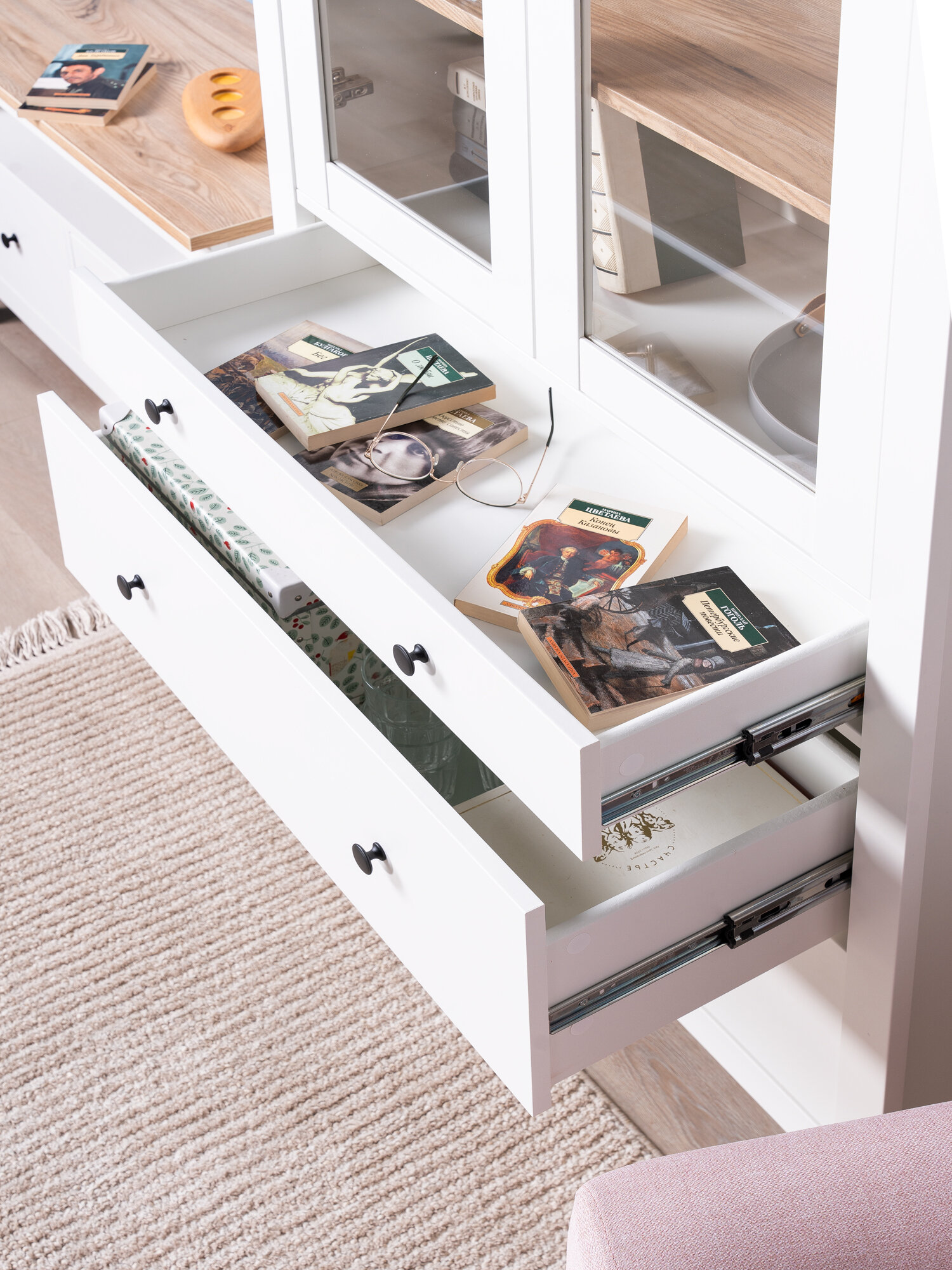 Модель сочетает закрытые секции и стеклянные витрины, что позволяет удобно хранить посуду, книги, декор и другие предметы, сохраняя порядок и лёгкость в интерьере.